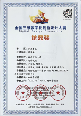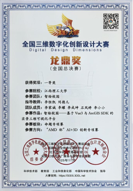 11月16日,由科学技术部、教育部、工业和信息化部、中国科学技术协会联合指导,全国三维数字化技术推广服务与教育培训联盟主办的第18届全国三维数字化创新设计大赛全国总决赛在北京石油化工学院圆满落幕。我院学子组建的“智绘校园”团队凭借扎实的专业功底与创新实践能力,以作品《智绘校园——基于Vue3与ArcGIS SDK的实景三维可视化平台》一路过关斩将,先摘得江西赛区特等奖,再于全国总决赛中强势登顶,斩获“龙鼎奖”全国一等奖(“AMD杯”AI+3D创新专项赛赛道),充分展现了江理学子过硬的专业素养与突出的实践创造力。