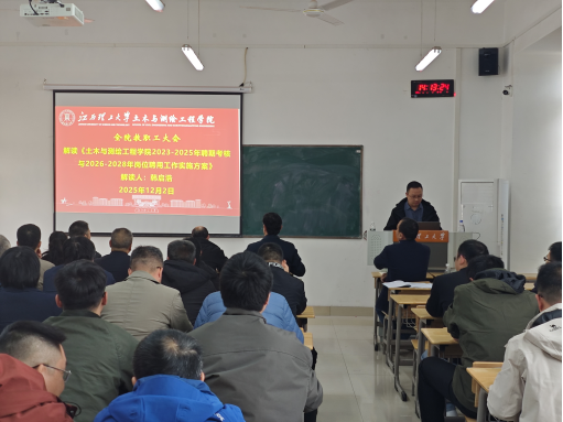 会议伊始,学院党政办负责人韩启浩就《土木与测绘工程学院2023-2025年聘期考核与2026-2028年岗位聘用工作实施方案》进行了全面、细致的解读。他从方案制定的背景依据、聘期考核的核心指标、岗位聘用的流程标准等关键环节展开说明,确保每一位教职工都清晰掌握方案内涵。解读结束后,与会教职工以无记名投票的方式对该方案进行表决,最终方案获得通过。此次方案的顺利通过,为学院接下来的人才队伍建设和岗位管理工作提供了坚实的制度保障,将进一步激发教职工的工作积极性与创造性。