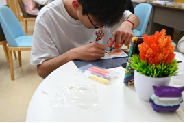 阳光透过活动室的窗户洒在桌面,照亮了同学们专注的侧脸和指尖跳动的色彩。有人为了勾勒一朵精致的宝莲,反复弯折铜丝十余次,直到纹路完美契合;有人小心翼翼地填充釉料,每一笔都力求均匀细腻,生怕破坏整体美感;还有同学相互协作,互相帮忙修正铜丝弧度、分享配色技巧,现场气氛既专注热烈又温暖融洽。 原本素色的底板,在同学们的指尖雕琢下,逐渐褪去单调,金丝勾勒的轮廓愈发清晰,釉料填充的色彩愈发绚丽,一件件独具匠心的作品悄然诞生,现场不时响起阵阵赞叹与欢呼。